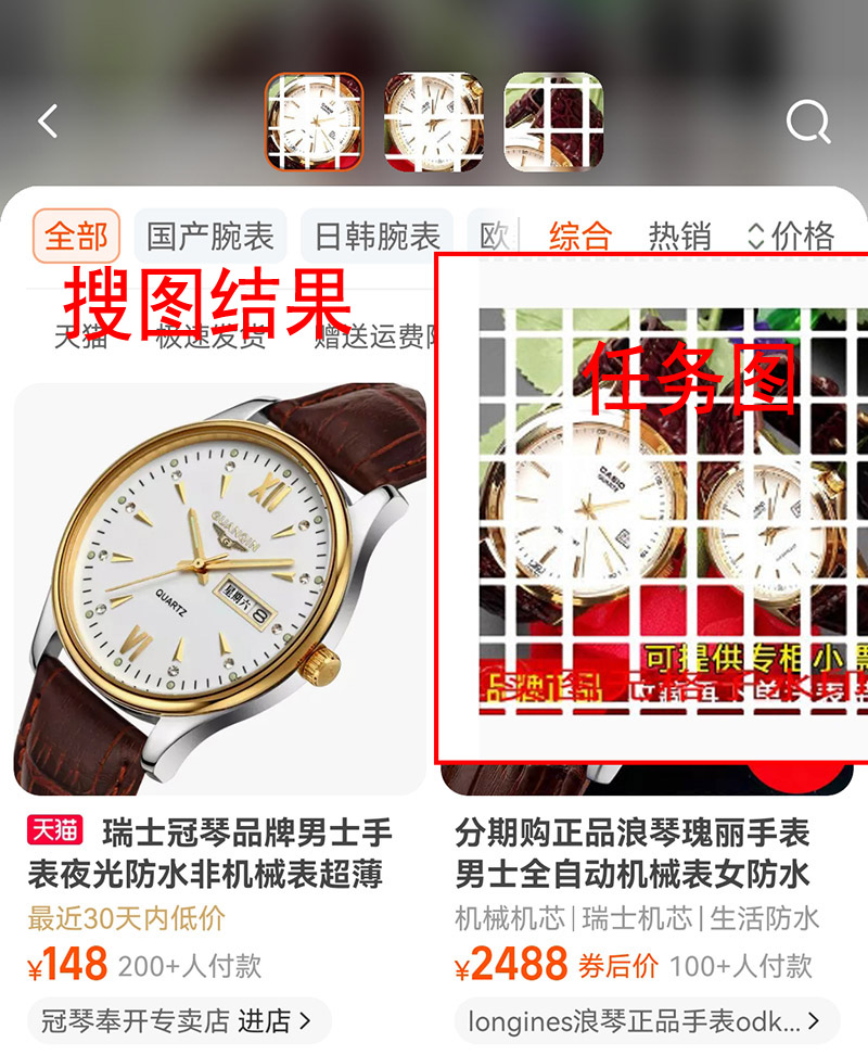 可以看到我们的密集格子水印,虽然淘宝能识别出来是手表,但款式图片差的很远;而其他平台的简单米字印完全影响不到淘宝识别系统,搜索出来的结果一模一样。一些不负责任的买手就会用以图搜款功能来做你的任务达到节省时间的目的,聪明一点的会浏览后再用关键词搜一遍来找你的产品进店以欺骗你是从搜索进来的,因为有了浏览痕迹搜索排名就会靠前,但对关键词权重是没什么用的。