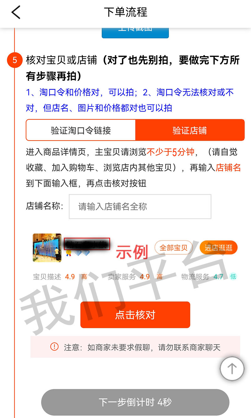 2、核对是否找对店铺/商品时也完全不展示商家的店铺信息,只要求买家输入在淘宝认为找对的店名然后系统自动核对,,找对时会弹出正确的提示框。所以商家尽量不要修改店名,如必要改也要第一时间联系平台客服,在后台更新你的店名,否则会影响买家进行任务